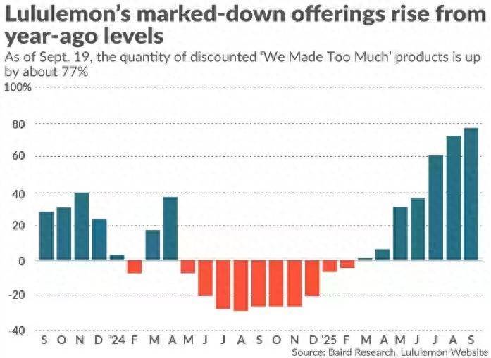 阿尔特施瓦格表示,截至 9 月 19 日,Lululemon“我们做得太多”专区提供的折扣商品比一年前增加了 77%。他表示,这是至少两年来的最高水平,比上个月略有上升。